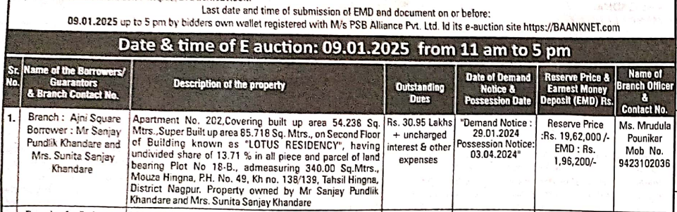 Apartment No. 202, Covering built up area 54.238 Sq. Mtrs., Super Built up area 85.718 Sq. Mtrs., on Second Floor of Building known as "LOTUS RESIDENCY", having undivided share of 13.71% in all piece and parcel of land bearing Plot No 18-B., admeasuring 340.00 Sq.Mtrs., Mouza Hingna, P.H. No. 49, Kh no. 138/139, Tahsil Hingna, District Nagpur. Property owned by Mr Sanjay Pundlik Khandare and Mrs. Sunita Sanjay Khandare