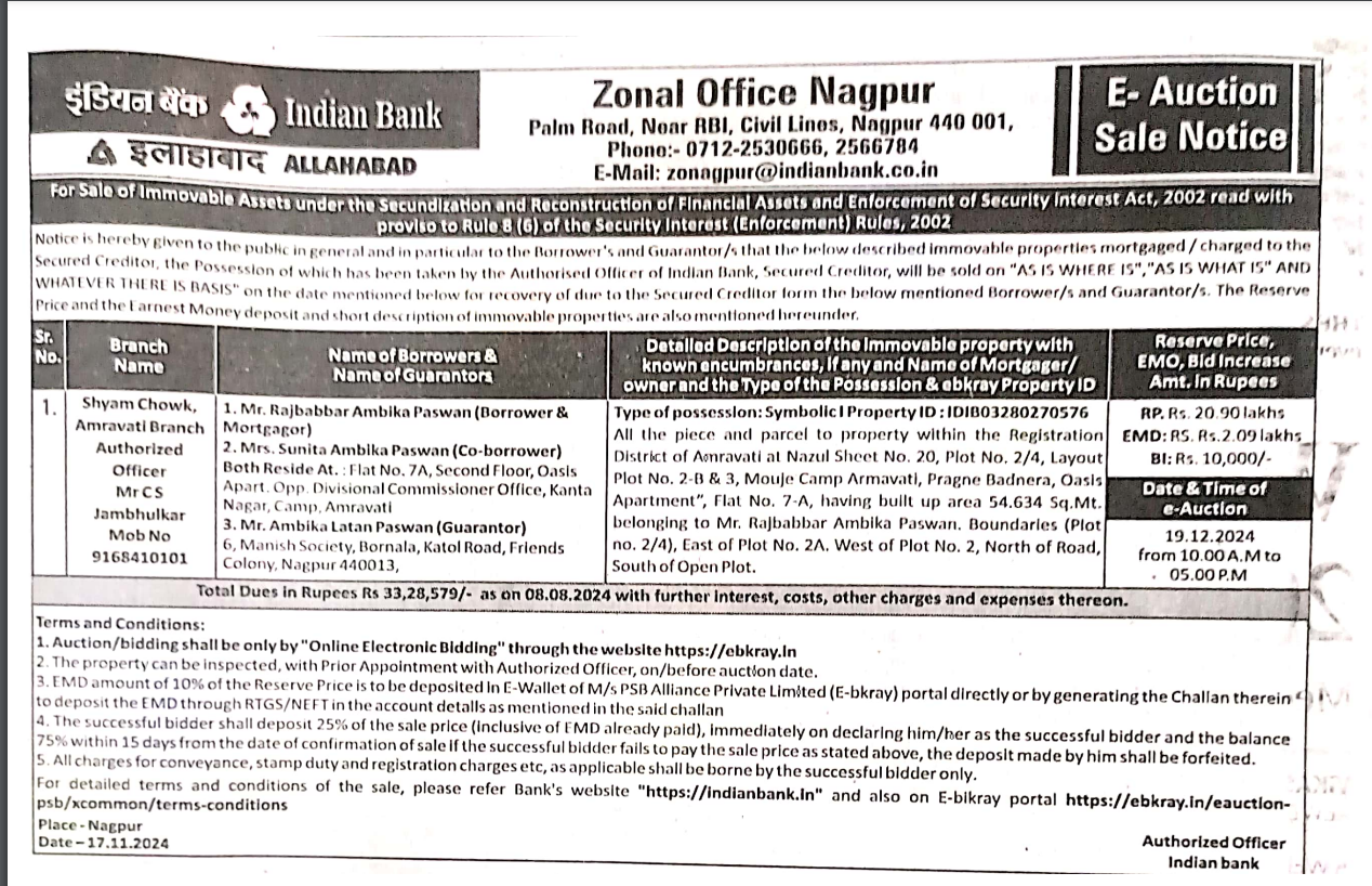 All that piece and parcel of the land bearing Survey No. 364 as per the sale deed admeasuring area 2152 sq.ft. i.e. 200 sq.mtr. Vaacant Plot, Kasbe Washim 3 within the Nagarparishad Washim. Taluka and District Washim. North by: Remaining own place South by: Road East by: Road West by: Road Situated at within the Sub-Registration District of Washim and Registration District of Washim. Together with all buildings and structure attached to the earth or permanently fastened to anything attached to earth, both present and future and all easamentary/mamool rights annexed thereto. Reserve Price: Rs.17,22,000/- Earnest Money Deposit: Rs. 1,72,200/-