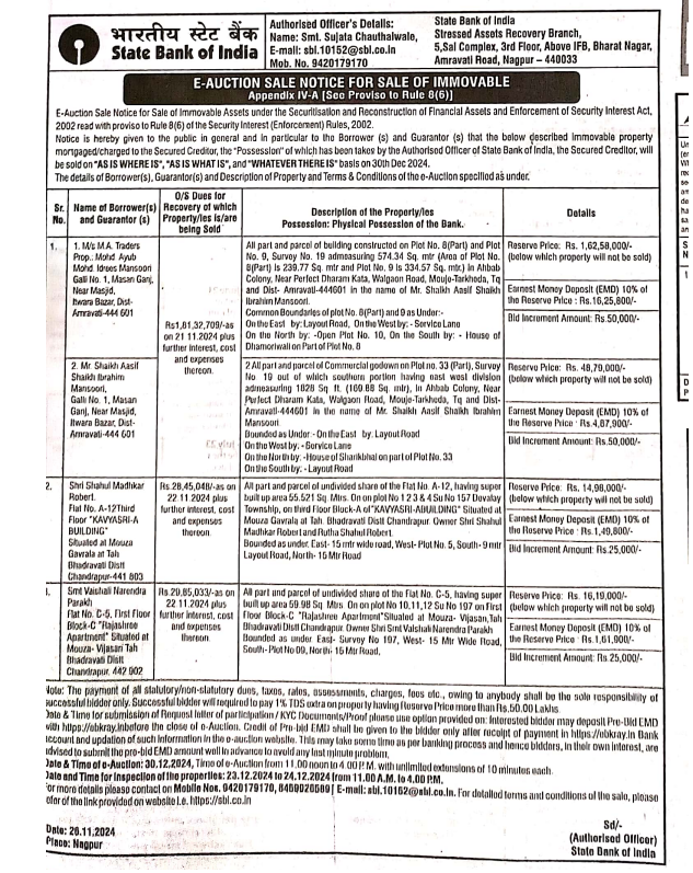 All part and parcel of bullding constructed on Plot No. 8(Part) and Plot No. 9, Survey No. 19 admoasuring 574.34 Sq. mtr (Area of Plot No. B(Part) Is 239.77 Sq. mtr and Plot No. 9 Is 334.57 Sq. mtr.) In Ahbab Colony, Near Perfect Dharam Kata, Walgaon Road, Moujo-Tarkhoda, Tq and Dist- Amravall-444601 in the name of Mr. Shalkh Aaslf Shaikh Ibrahiın Mansoori. Reserve Price: Rs. 1,62,58,000/- (below which property will not be sold) Comnon Boundaries of plot No. 8(Part) and 9 as Under:- On the East by: Layout Road, On the West by: -Service Lano On the North by: Open Plot No. 10, On the South by: House of Dhamoriwali on Part of Plot No. 8