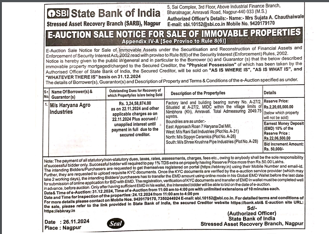 Factory land and building at Nimbhora (Kh), Amravati. M/s Haryana Agro Industries ( Borrower ) | Auction Properties in Amravati | SBI/8011/191224