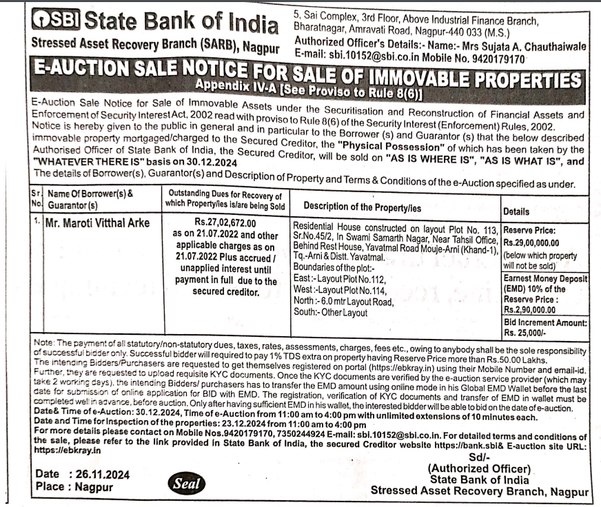 Residential House at Mouje-Arni, Yavatmal. Mr. Maroti Vitthal Arke ( Borrower ) | Auction Properties in Yavatmal | SBI/8013/301224