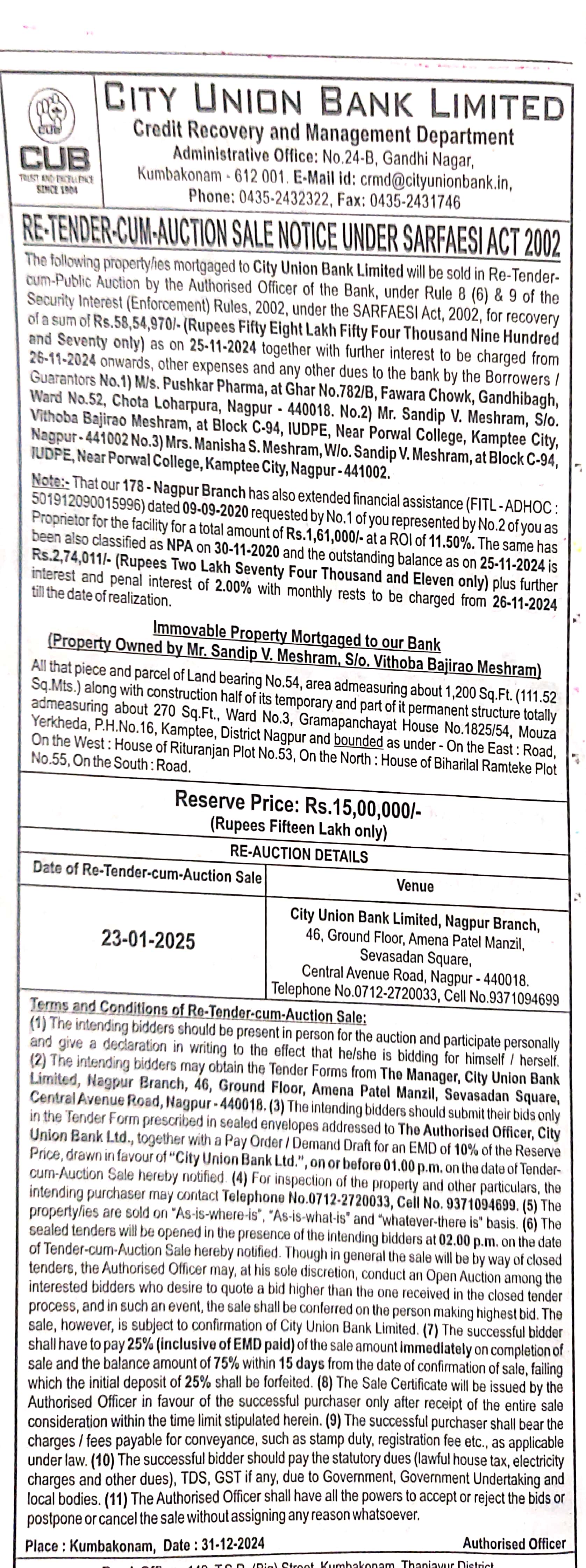 Land at mouza Yerkheda, M/s. Pushkar Pharma, ( Borrower ) | Auction Properties in Nagpur | CUB/100008/230125