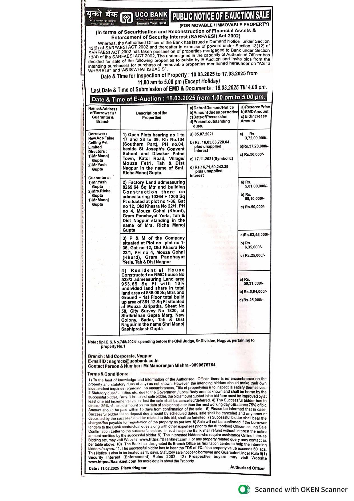 Plant & Machinery at mouza-Gohni Khurd, New Age False Celling Pvt Limited ( Borrower ) | Auction Properties in Nagpur | UCO/510027/180325